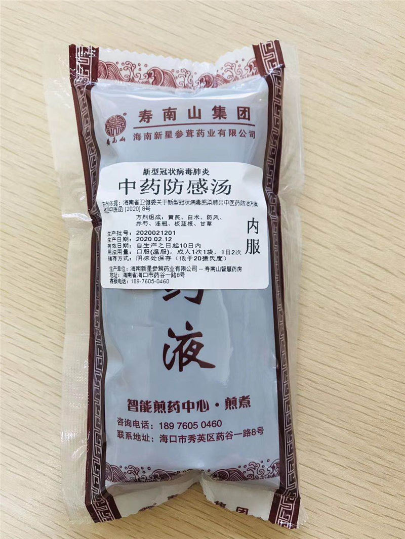 在當前新型冠狀病毒感染肺炎疫情防控工作的關(guān)鍵時期,海南新星參茸藥業(yè)有限公司壽南山智慧藥房在壽南山集團的統(tǒng)一安排下,積極落實各級黨委政府抗擊疫情的相關(guān)部署要求,深入踐行習總書記“生命重于泰山,疫情就是命令,防控就是責任”的指示,積極踐行社會責任,參與疫情防控工作。自2020年1月26日以來,應海南省中醫(yī)院委托,我司協(xié)助海南省中醫(yī)院集中代煎針對此次疫情防治的中藥防感湯劑(方劑出自海南省衛(wèi)生健康委員會關(guān)于印發(fā)《海南省新型冠狀病毒感染的肺炎中醫(yī)防治方案(試行)的通知》瓊衛(wèi)中醫(yī)函[2020] 8號,該防感湯劑主要提供給奮戰(zhàn)在一線的工作人員,為一線工作人員健康保駕護航。該中藥防感湯劑藥味不多,藥性平和,適合一般人群包括孕婦、小孩?诜栏袦梢蕴岣咦陨砻獾囊吡Γ鸬娇共《镜淖饔。